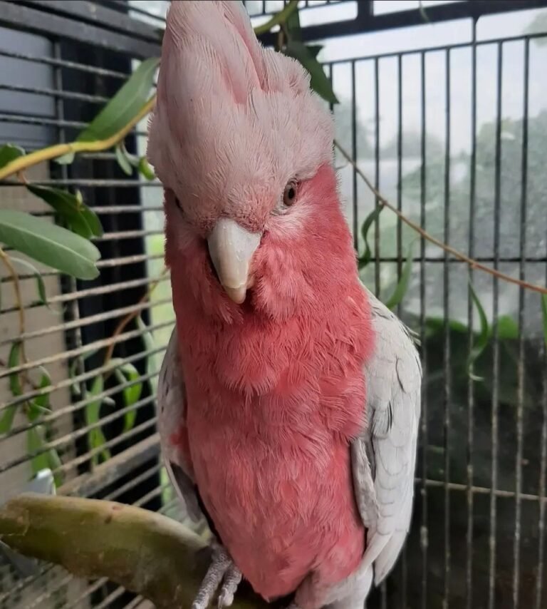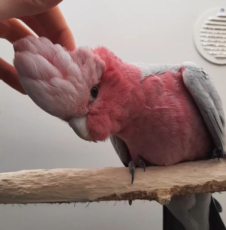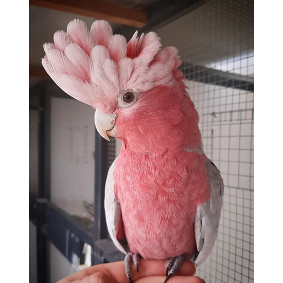 April is a pink and grey cockatoo also known as the rose breasted cockatoo or Galah cockatoo. She’s a sweet little girl, very cuddly, social, already loves mimicking, whistling and enjoys being around humans.